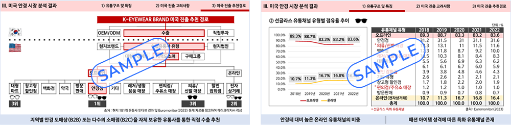 - 제품군별 현지 유통 채널의 현황 및 특징을 파악하여 판매 채널 확장 계획을 수립 할 수 있습니다.