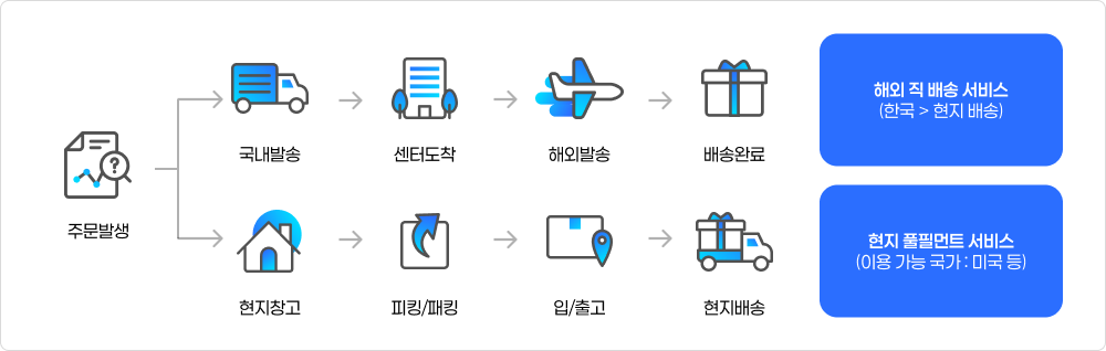 - 해상, 항공 운송, 통관 등 국내 픽업부터 현지 배송까지 해외 직배송 서비스를 제공하고 있으며 배송 뿐 아니라 현지 풀필먼트 이용에 대한 적합 여부, 계약 과정을 함께합니다.