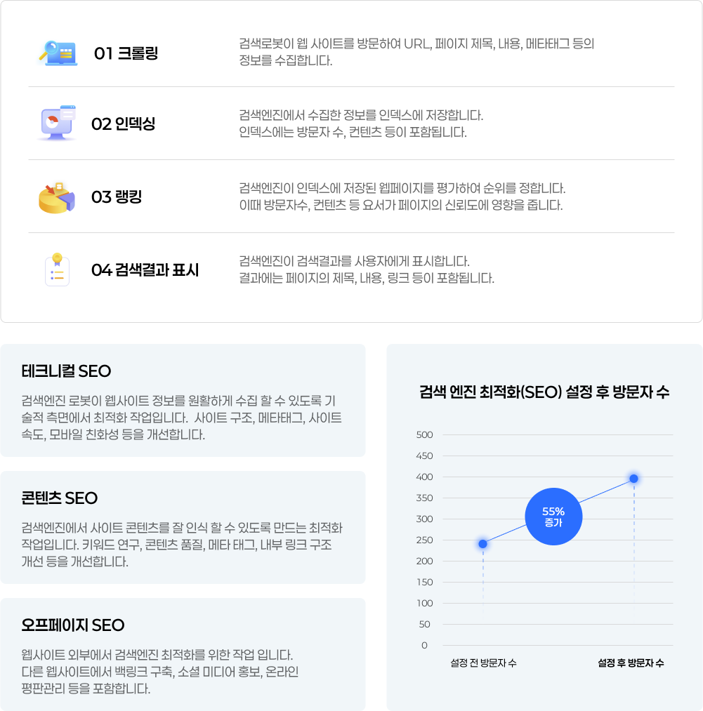 검색엔진 최적화 작업을 통해 다양한 검색엔진에서 쇼핑몰, 상품 페이지를 노출해보세요.