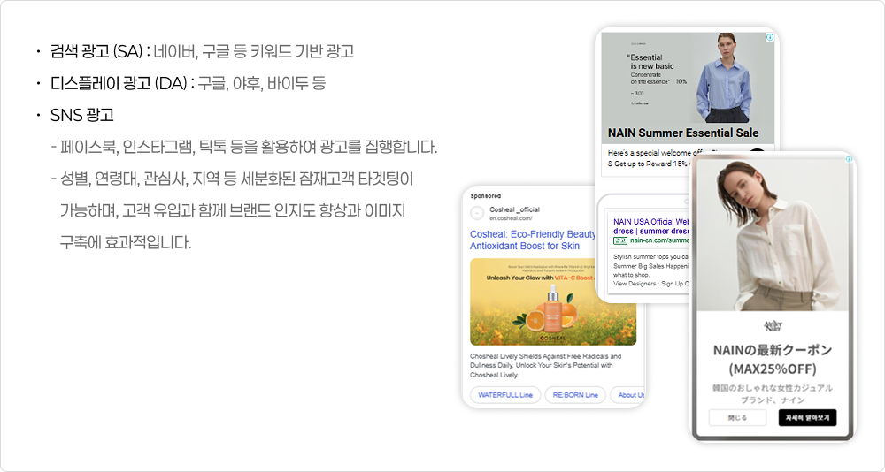 - “현지 문화+디지털 성과” 전략적 접근을 통해 데이터를 기반으로 광고의 효과를 극대화하고, 구매 전환율을 상승 시킵니다.