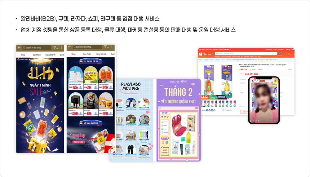 - 자사몰 뿐 아니라, 해외 오픈 마켓 판매까지 판매 확장을 원하는 판매자를 위해 아래와 같이 입점/판매/ 운영 대행 서비스를 제공합니다.